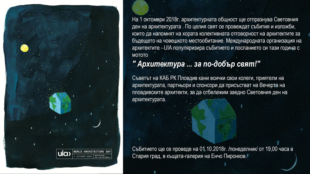Уважаеми колеги, приятели, партньори и спонсори, Каним всички Ви, да присъствате на Вечерта на пловдивските архитекти, за да отбележим заедно Световния ден на архитектурата,...