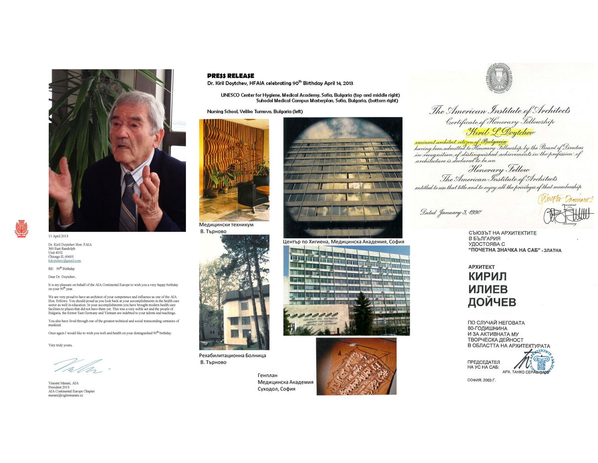 Камарата на архитектите в България (КАБ) поздравява д-р арх. Кирил Дойчев, който на 15 април отбелязва 100 годишен юбилей. Той е автор на проектите на едни от най-големите болници в България – Бургас, Ямбол, Велико Търново, Каварна, Русе, Кърджали, Шумен, Центъра по хигиена в София и много други. През последните 40 години живее в Чикаго, където e консултант в Rada Architects. Носител е на множество национални и международни отличия.