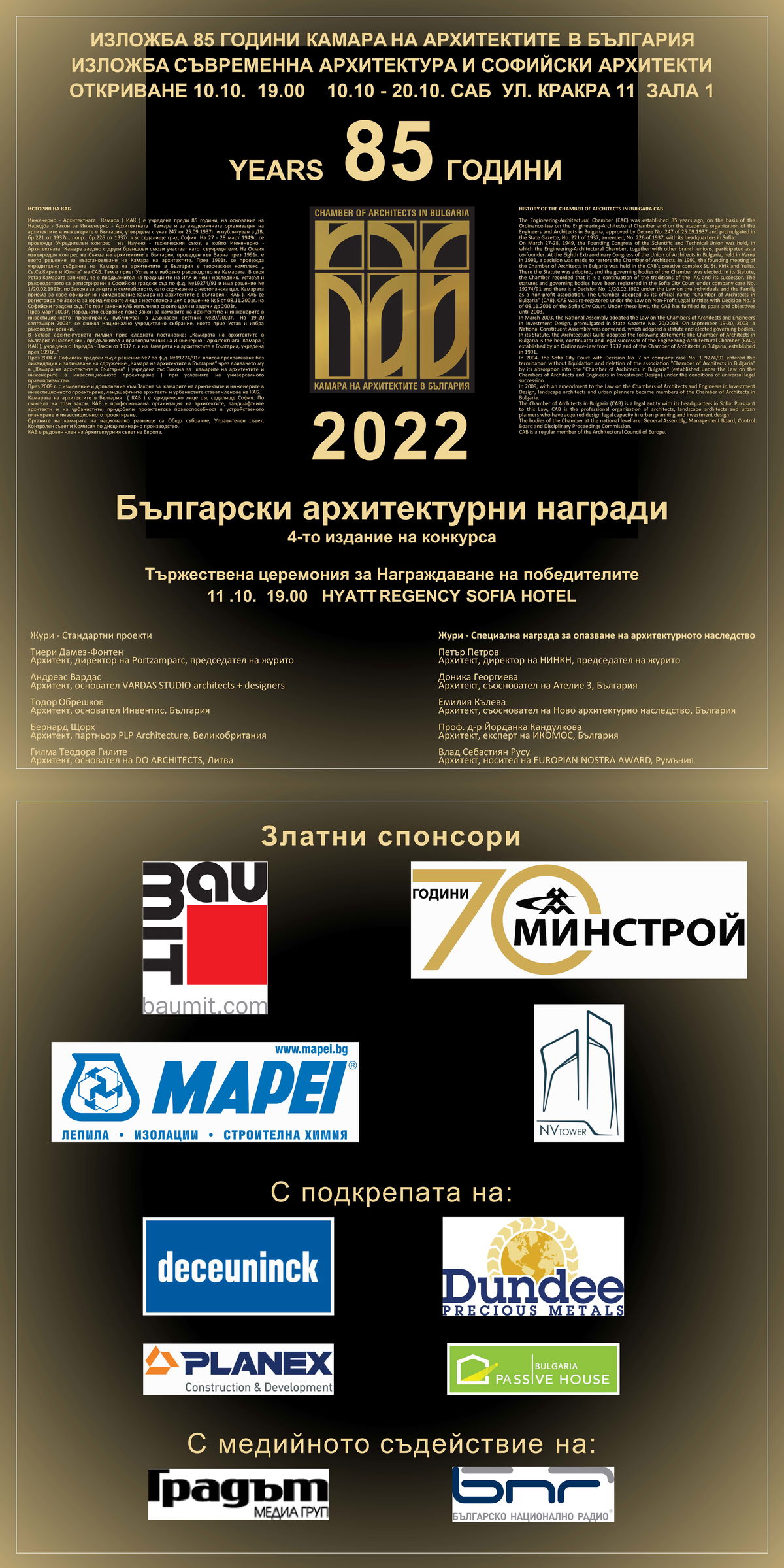 На 10 октомври (понеделник) 2022, от 19:00 часа, в Централния дом на архитекта в София на ул. „Кракра“ 11 ще бъдат официално открити две изложби: “85 години Камара на архитектите в България” и “Съвременна архитектура и софийски архитекти”. По повод юбилея, на събитието ще бъдат връчени отличия за почетни членове и почетни знаци на КАБ за заслуги към архитектурната професия.