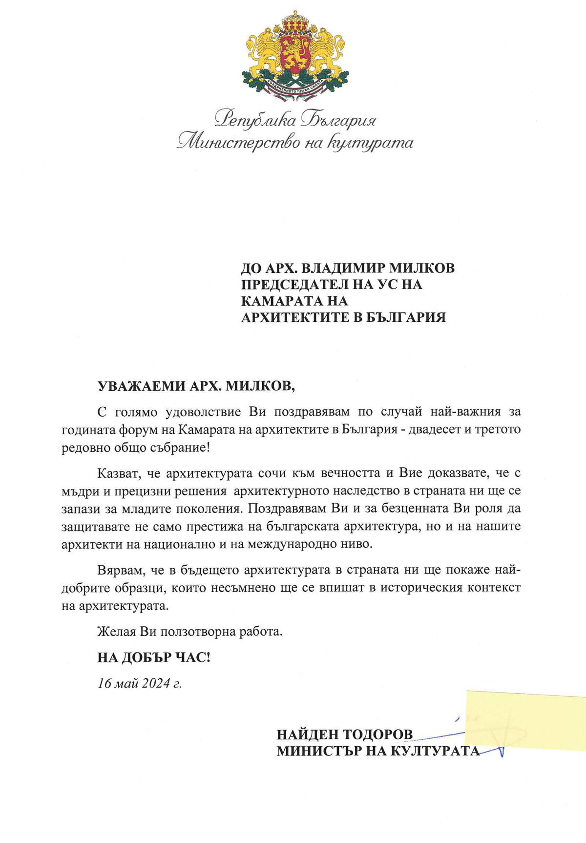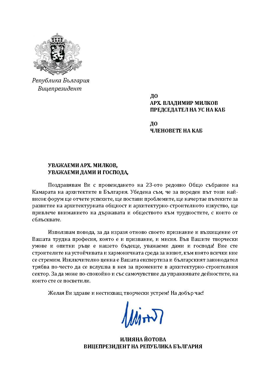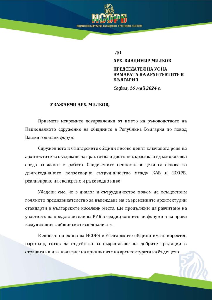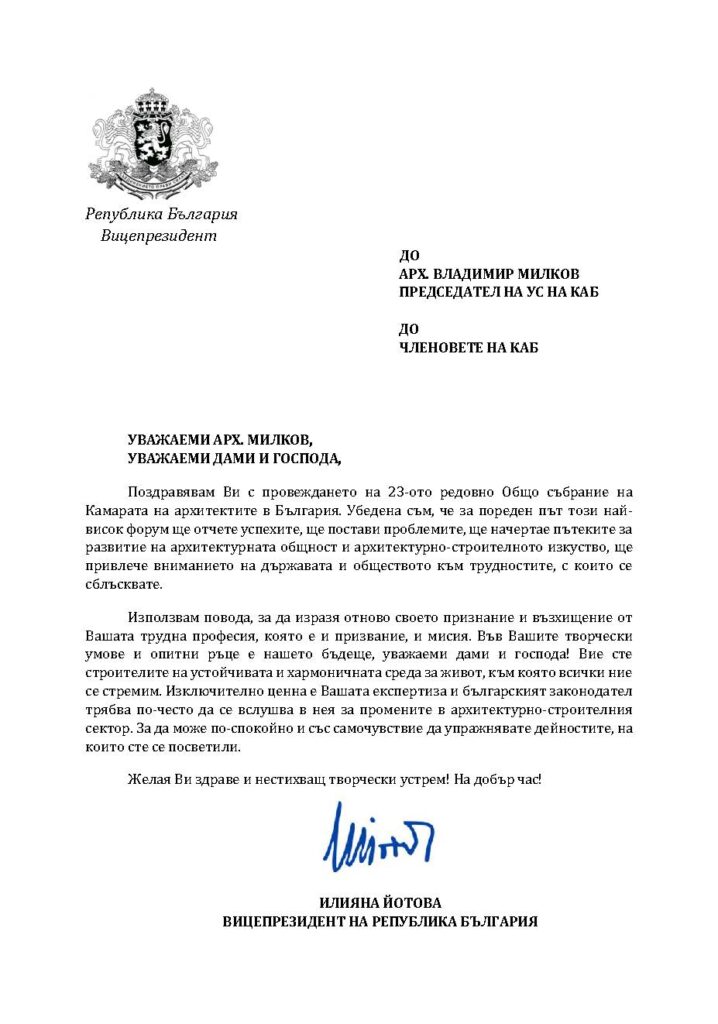 Поздравителни адреси по повод събитието бяха получени от президента на Архитектурния съвет на Европа (АСЕ) арх. Рут Шагеман, вицепрезидента Илияна Йотова, министъра на регионалното развитие и благоустройството Виолета Коритарова, министъра на културата Найден Тодоров, Националното сдружение на Република България (НСОРБ), Камарата на строителите в България (КСБ), Дирекция за национален строителен контрол (ДНСК) и много други. Приветствия към гостите отправиха Иван Алексиев, кмет на Поморие; арх. Петър Диков, председател на Съюза на архитектите в България; ланд. арх. Веляна Найденова, председател на Съюза на ландшафтните архитекти и урб. Ирина Мутафчийска, председател на Съюза на урбанистите в България.