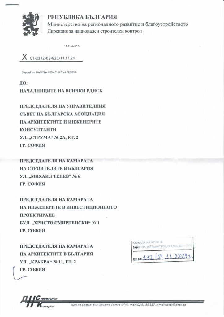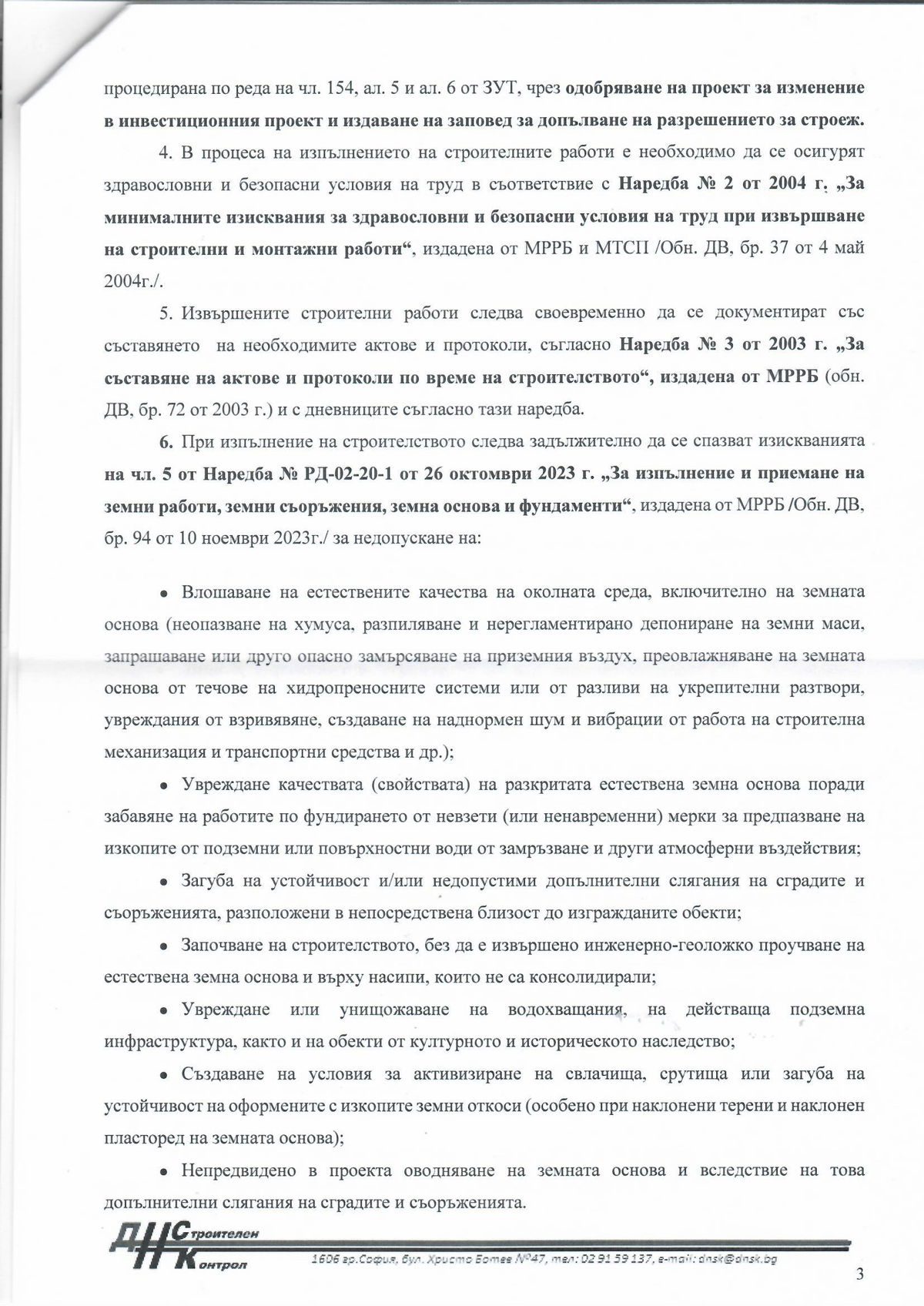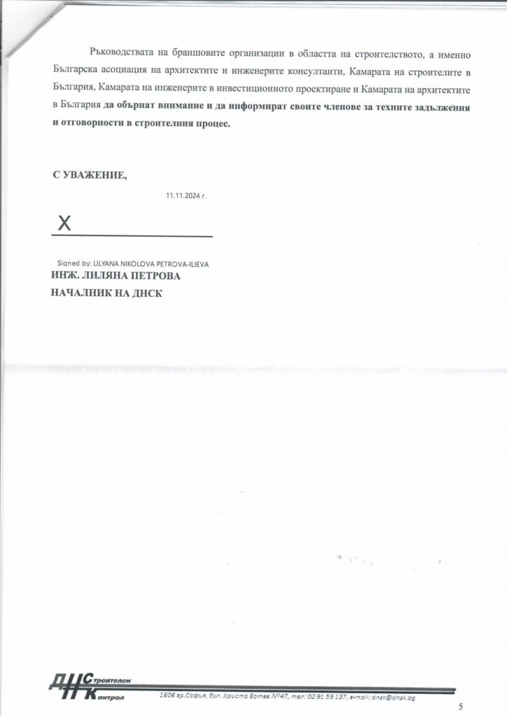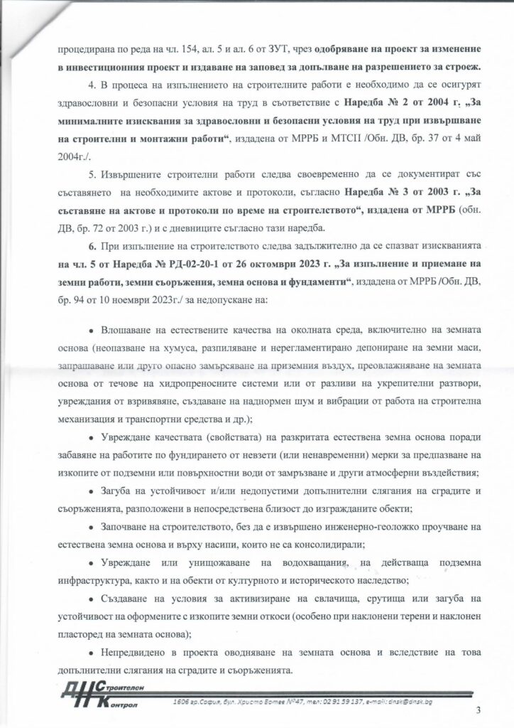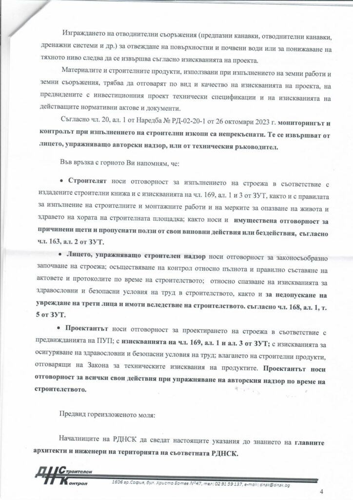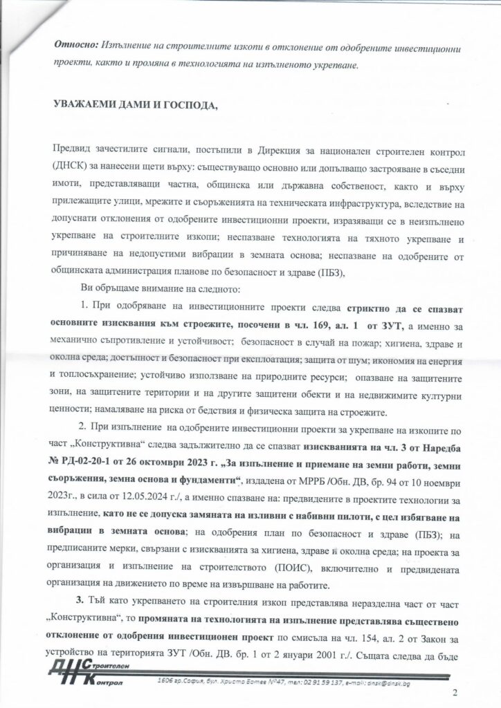15 ное. Писмо от ДНСК относно изпълнението на строителни изкопи