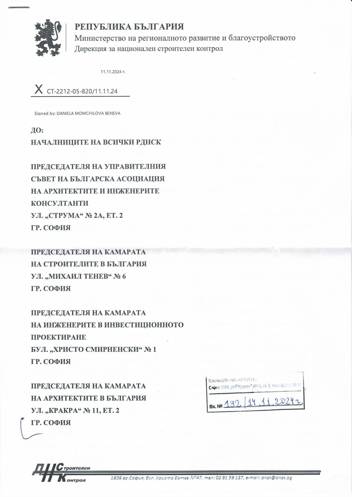 Камарата на архитектите в България (КАБ) получи указателно писмо от ДНСК относно изпълнението на строителни изкопи в отклонение на одобрените инвестиционни проекти, както и промяна в технологията на изпълненото укрепване. Писмото е по повод зачестили сигнали за нанесени щети върху съществуващото застрояване в съседни имоти.