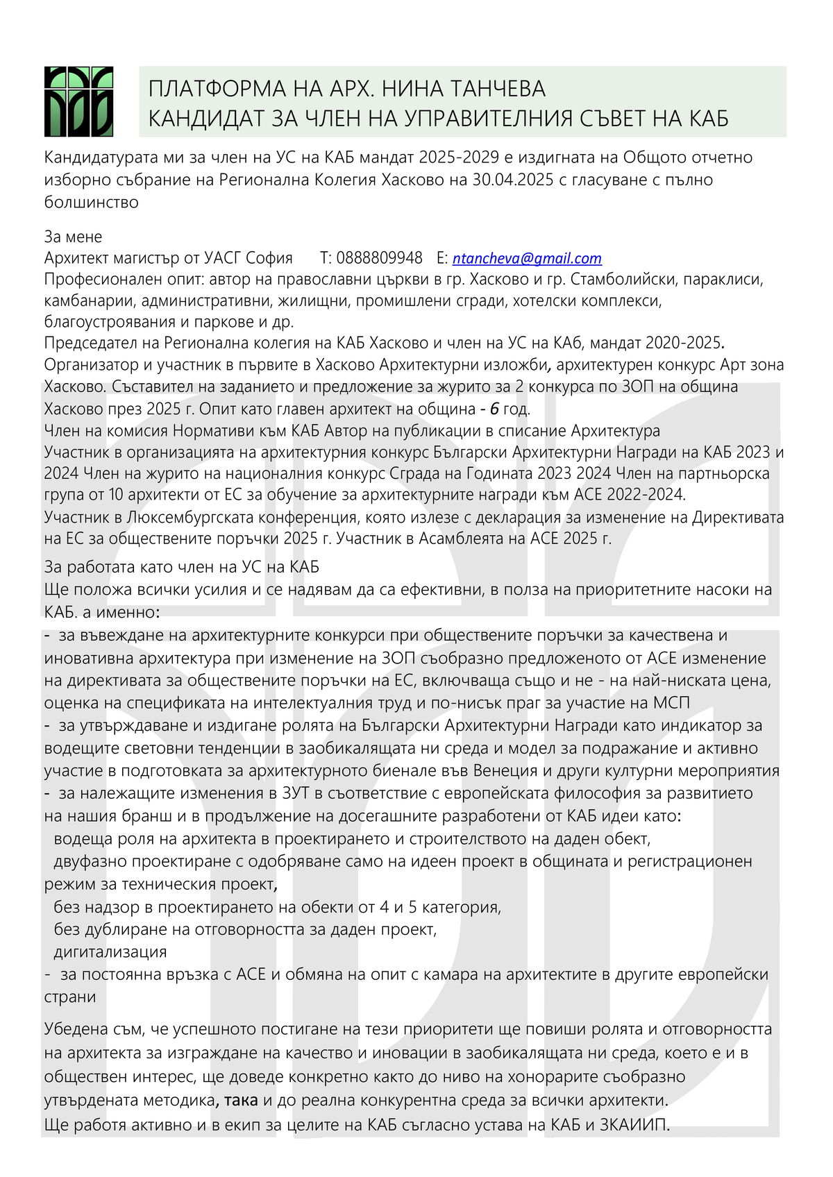 Платформа на арх. Нина Танчева за член на УС на КАБ