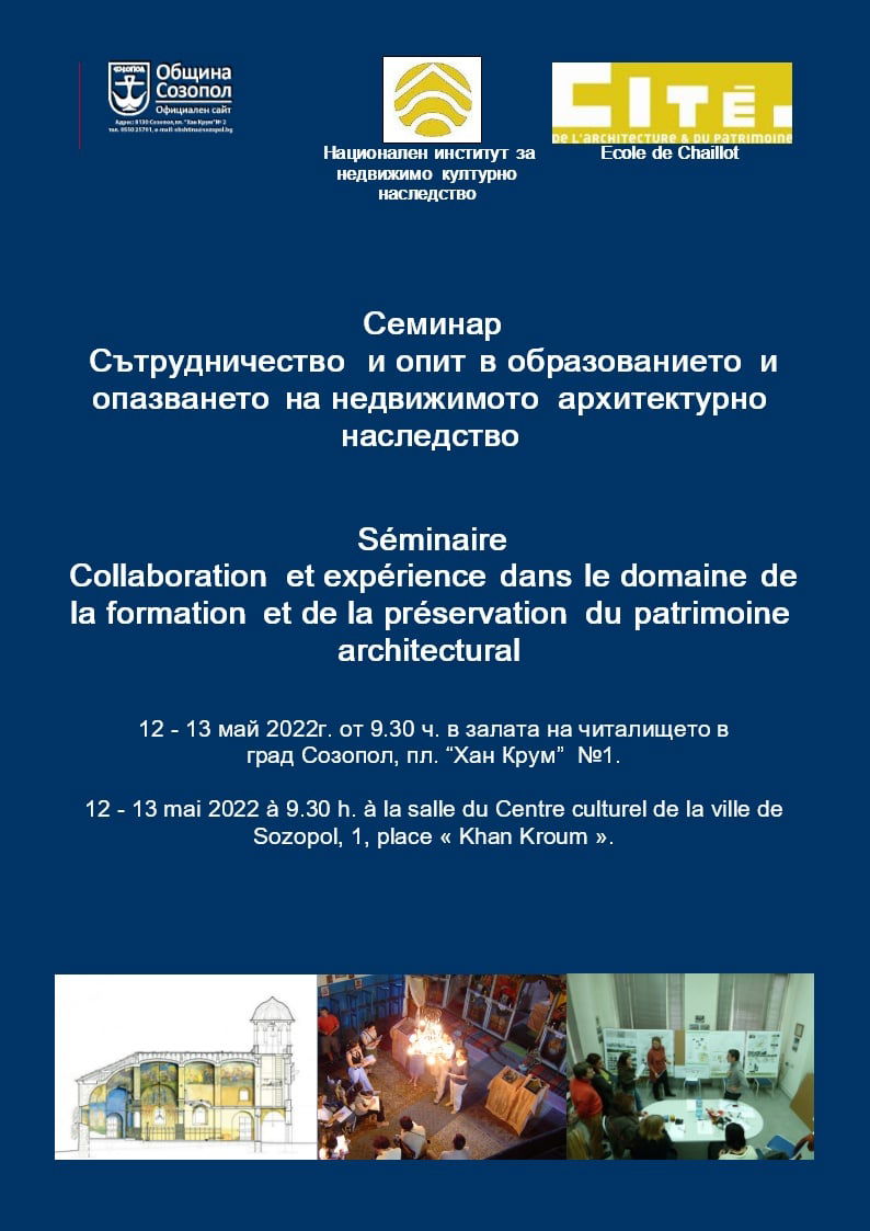 Националният институт за недвижимо културно наследство и френският институт Екол дьо Шайо организират на 12 и 13 май 2022г. семинар „Сътрудничество и опит в образованието и опазването на недвижимото архитектурно наследство“. Домакин е община Созопол.