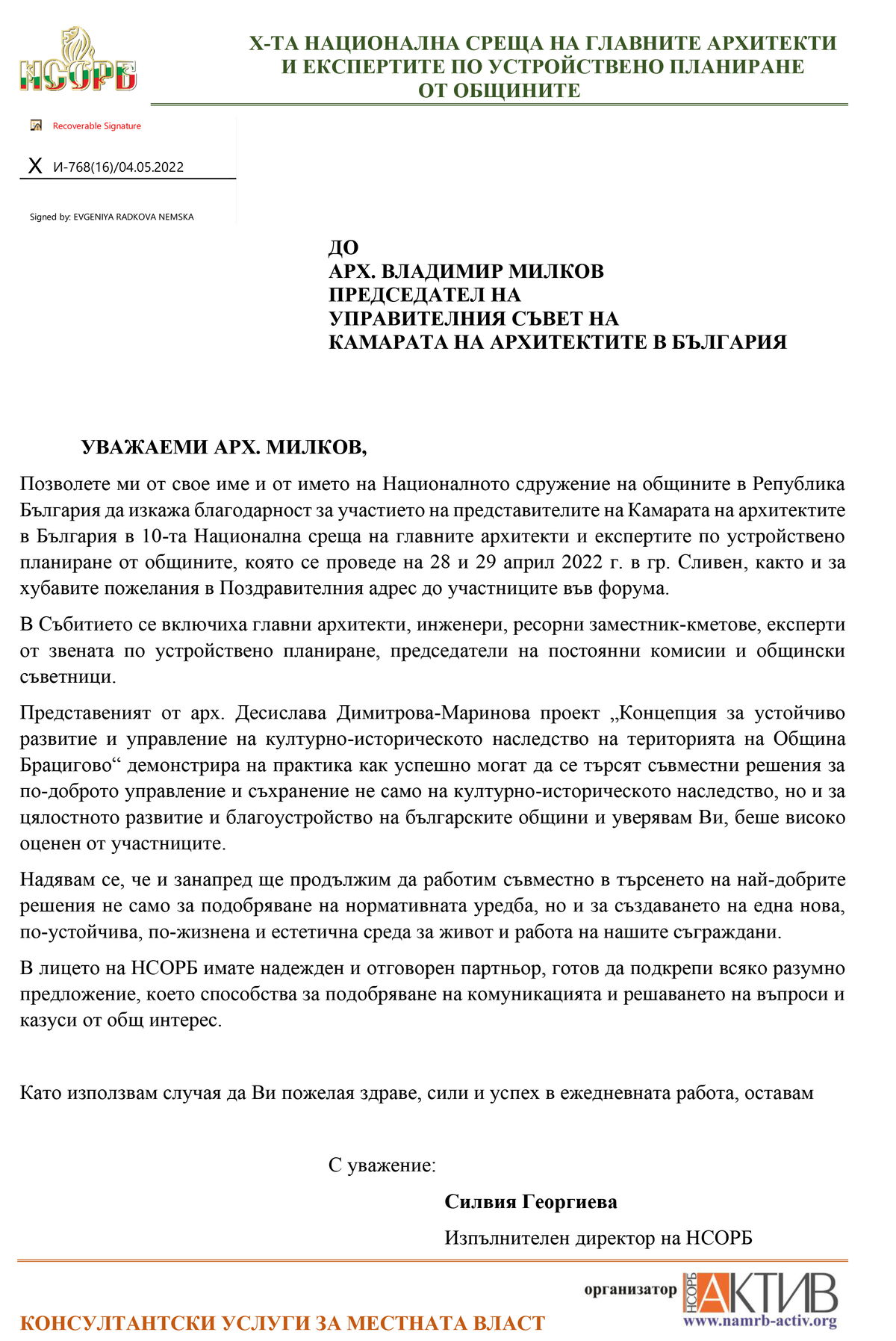 Над 70 представители на общините взеха участие в Десетото издание на Националната среща на главните архитекти и експертите по устройствено планиране от общините, която се проведе от 27 до 29 април 2022 г. в Сливен, организирана от Националното сдружение на общините в Република България.