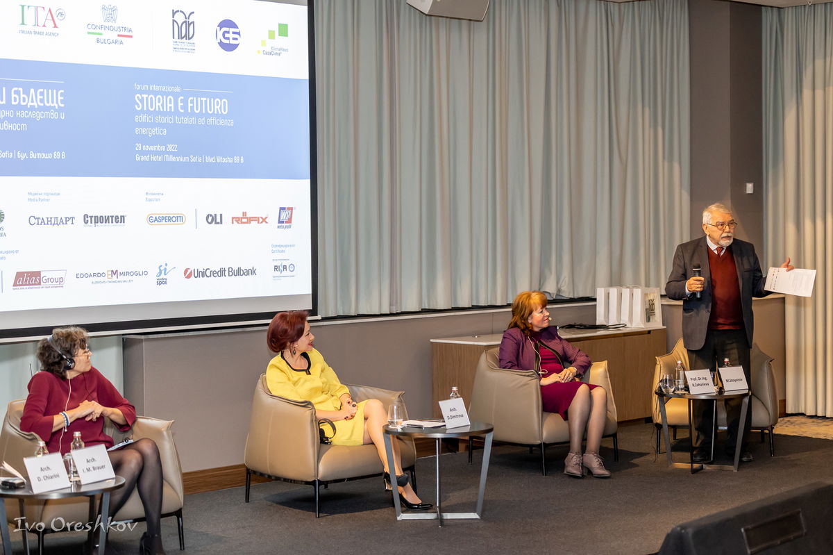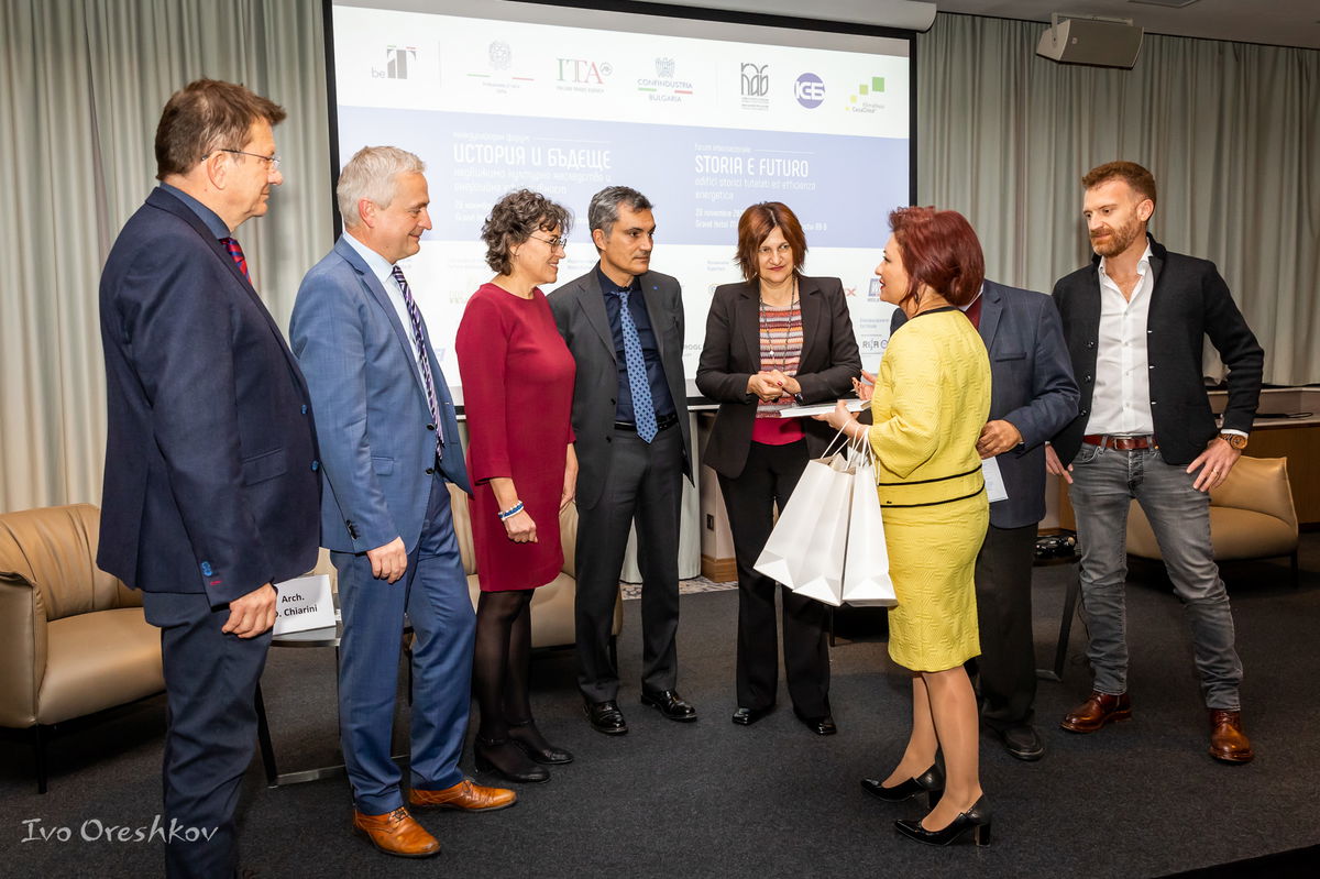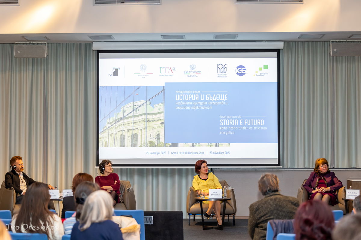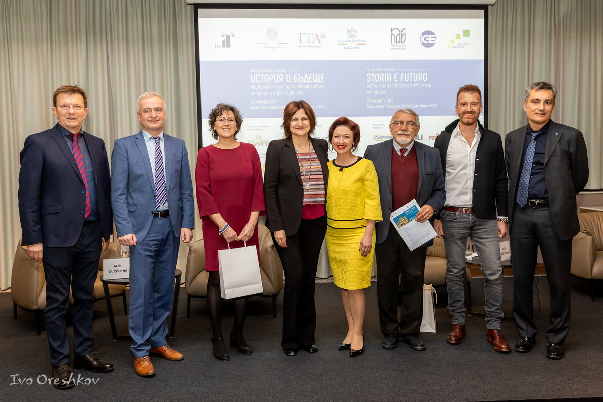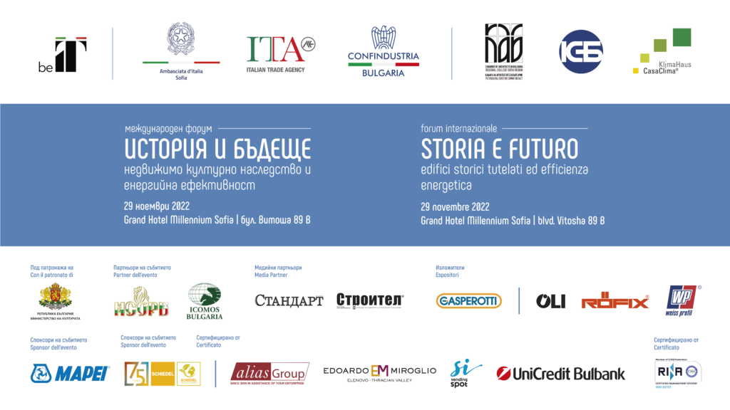 На 29 неомври в Гранд Милениум център в София бе проведен международният форум “ИСТОРИЯ И БЪДЕЩЕ” – посветен на недвижимото културно наследство и енергийната ефективност, под патронажа на Министерство на културата на България и с участие на Министерство на културата на Италия. Той бе организиран от Посолството на Италия в България, ИЧЕ – Агенция София, Конфиндустрия България в партньорство с Агенция CasaClima, Камара на Архитектите в България Регионална Колегия София Област и Камара на строителите в България. Събитието бе открито от Н.Пр. Джузепина Дзара, Посланик на Италия в София и доц. д-р Пламен Славов, заместник министър на културата, като продължи с встъпителните изказвания на Киара Петро, Директор на ИТА – Агенция в София, арх. Здравко Здравков, Главен архитект на Столична община, Роберто Санторели, Председател на Конфиндустрия България /Сдружение на италианското предприемачество в България/, арх. Константин Пеев, зам. председател на Камара на архитектите в България, Валентин Николов, изпълнителен директор на Камара на строителите в България.