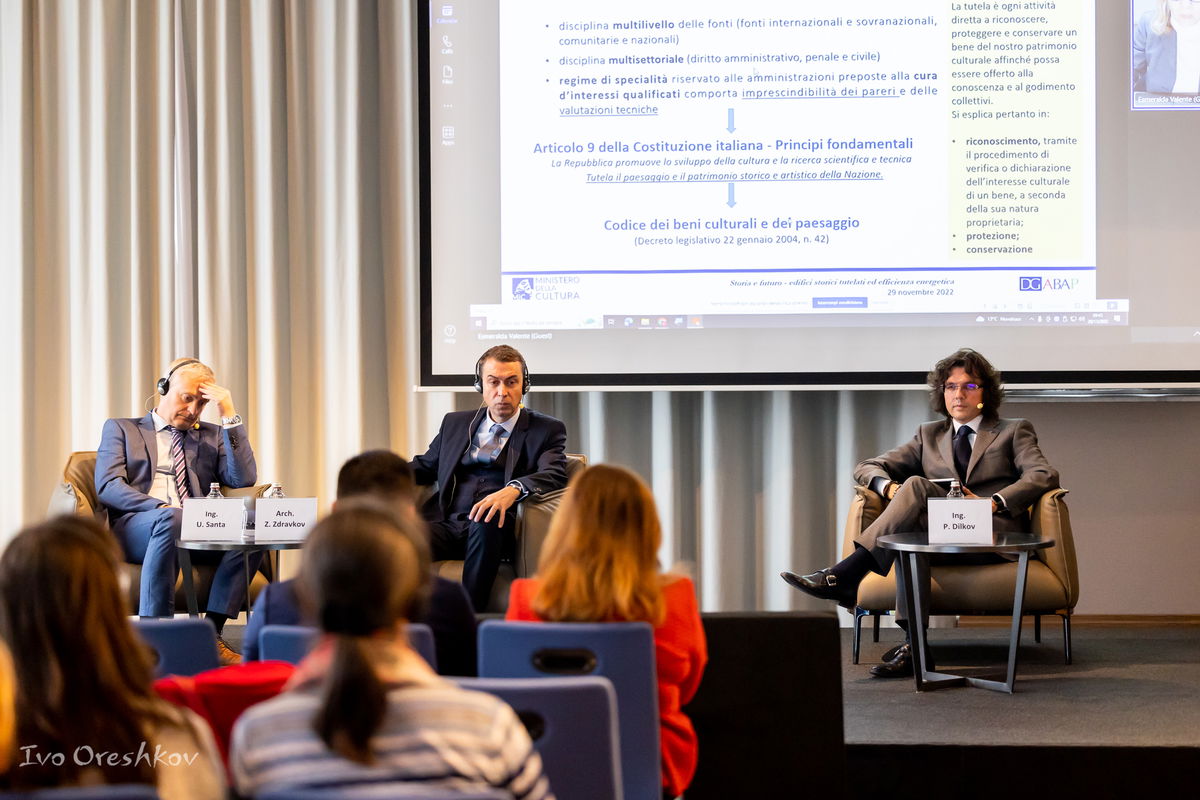Специалисти от Италия и България разгледаха подробно темата за опазването на недвижимото културно наследство и нуждата историческите сгради да бъдат обследвани и ремонтирани съобразно принципите за енергийна ефективност, запазвайки техния автентичен исторически облик, ревитализирайки ги за нов живот.
