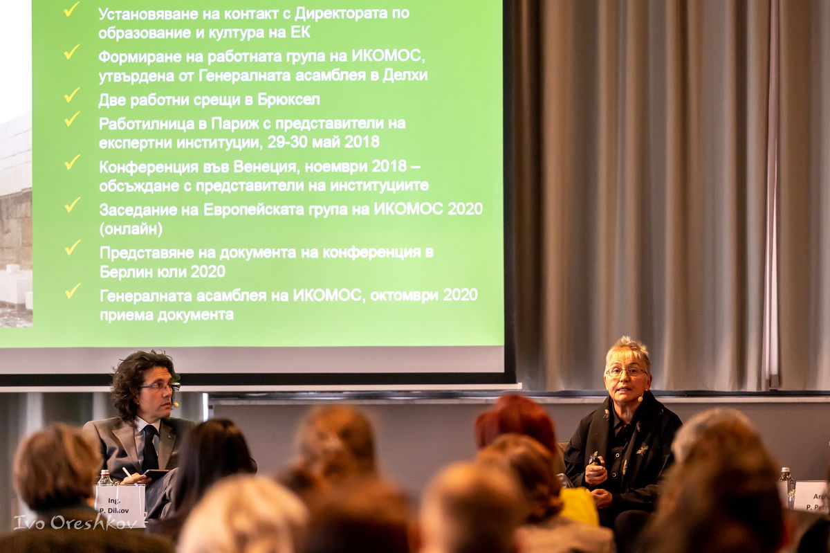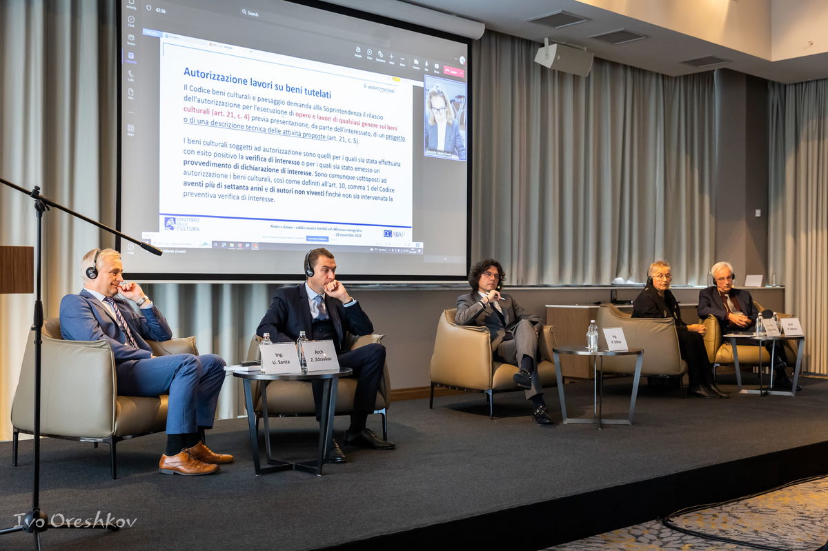 В дискусионна форма между специалисти в панел „Институционални модели за опазване на културното наследство в Италия и България“, бяха обсъдени различните подходи за управление на паметниците на културата в Италия и България. В дискусията взеха участие: арх. Есмералда Валенте, директор на Служба III Защита на историческото, художествено и архитектурно наследство, Министерство на културата на Италия, арх. Петър Петров, директор на Националния институт за недвижимо културно наследство, арх. Здравко Здравков, Главен архитект на Столична община, инж. Урлих Санта, генерален директор на Агенция CasaClima и доц. д-р арх. Елена Димитрова, представител на Българския национален комитет (БНК) на ИКОМОС в международната контактна група на ИКОМОС по приложение на “ЕВРОПЕЙСКИ ПРИНЦИПИ НА КАЧЕСТВОТО при финансирани от Европейския съюз на интервенции във физическата среда с потенциално въздействие върху културното наследство”.