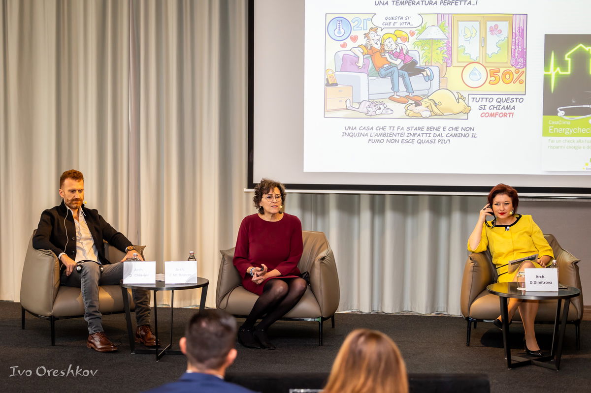 Арх. Дамиано Киарини и Арх. Дзено Бампи от Агенция CasaClima Италия бяха подготвили за българските специалисти от сектора, гости на събитието, презентации на успешни проекти за саниране на исторически сгради в Италия, където темата е широко застъпена, има установени практики и натрупан богат опит в опазването на културното богатство на страната.