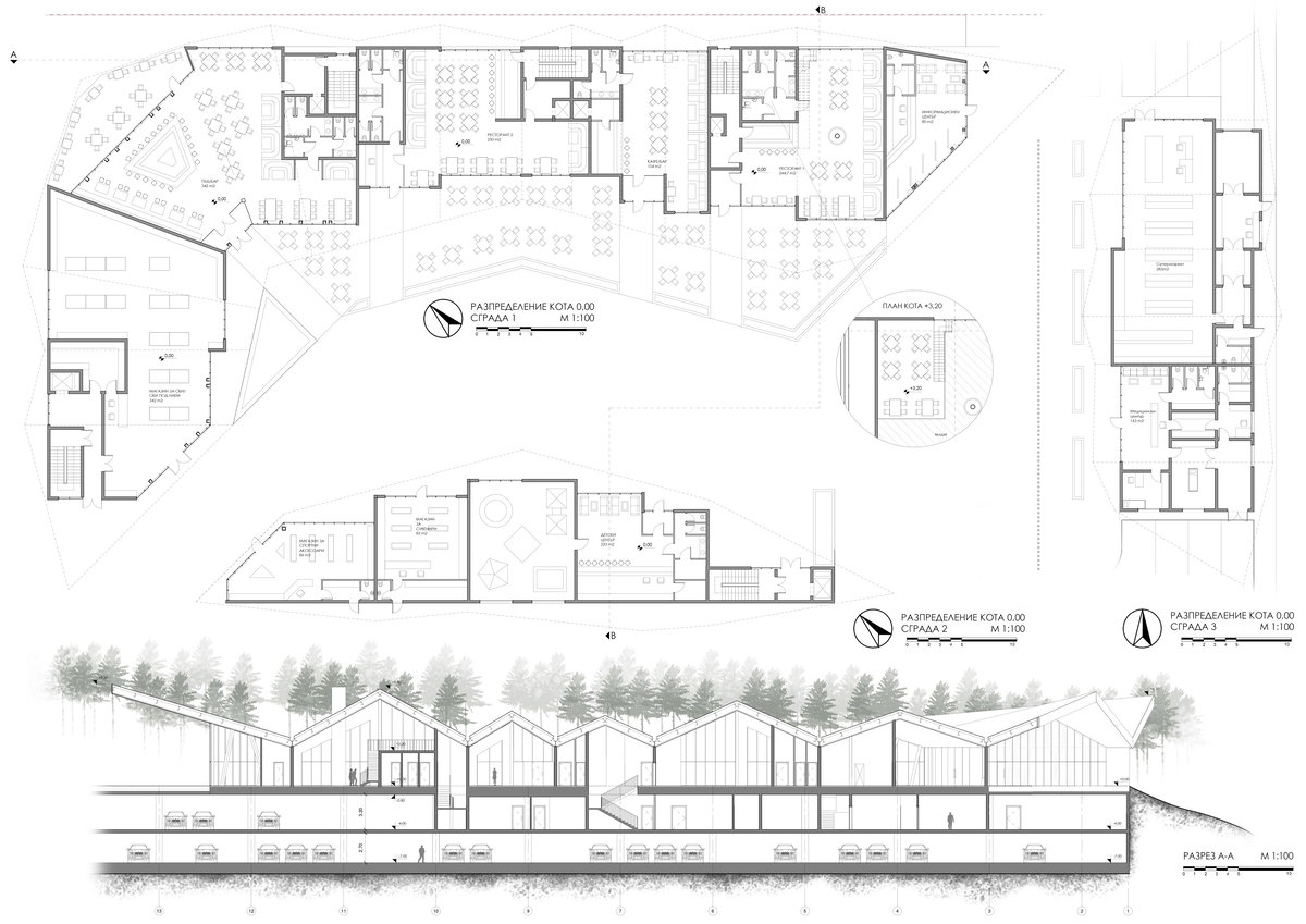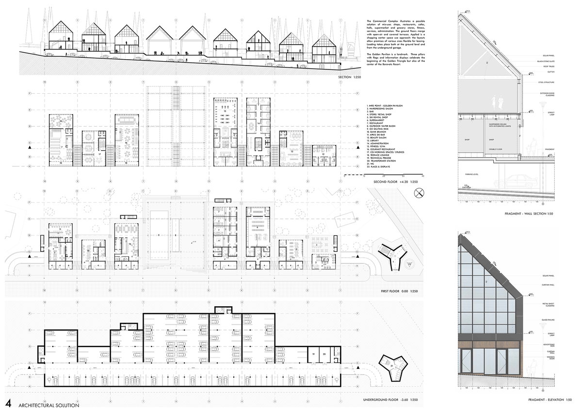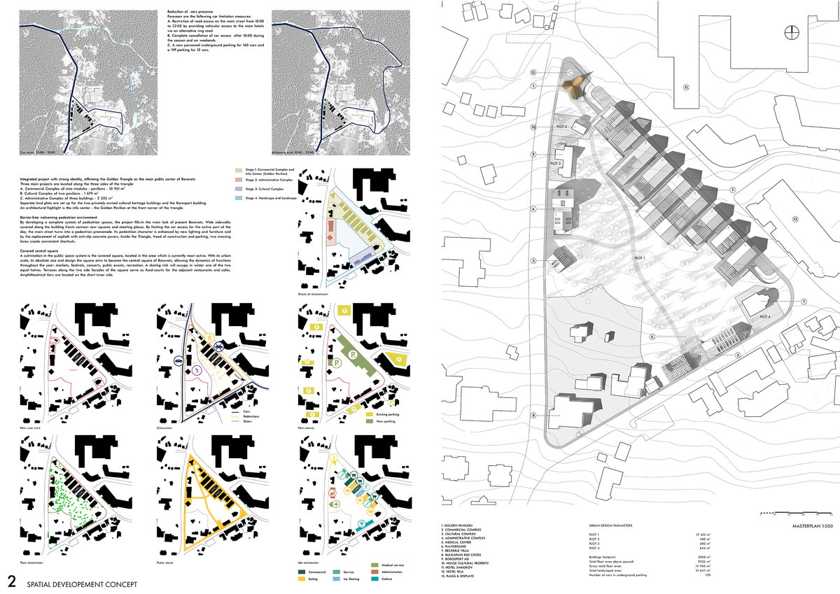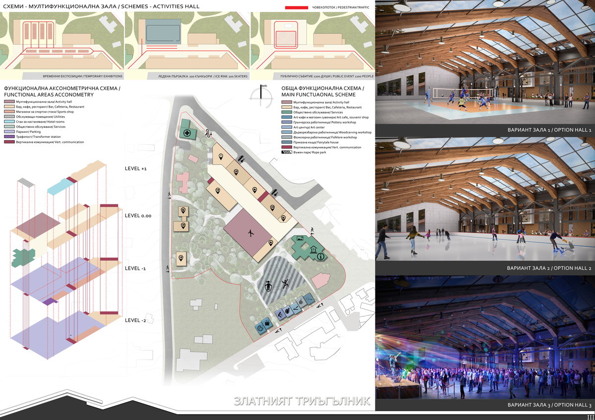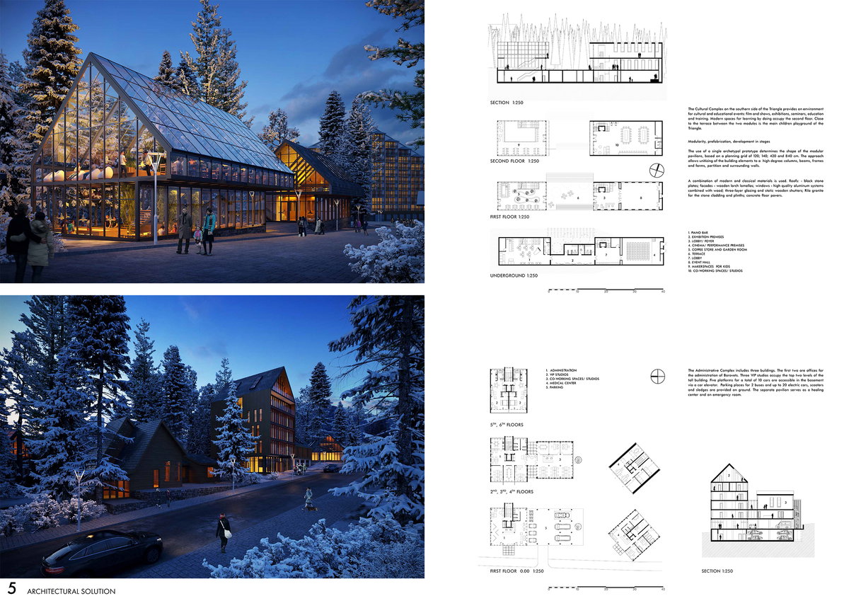 Поставеният на първо място проект отчита спецификата на контекста като уважава природния ландшафт и човешкия мащаб. Проектът предлага безопасна полупокрита ски, велосипедна и пешходна връзка между пистите и станциите на лифтовете, осигуряваща добра организация на различните комуникациони потоци в територията. Решението съвместява търговски площи, информационен център, пространства за спорт и рекереация, изложби и събития и подземно паркиране. Предложението обвързва съществуващите публични пространства с парковата среда в Триъгълника като изцяло я запазва и е чувствителен към разположените в територията обекти на недвижимо културно наследство.