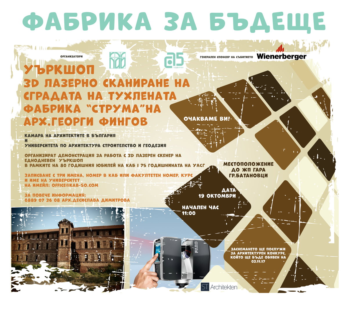 Като част от Юбилейното честване 80г. Камара на архитектите в България “Архитекти във времето”, имаме удоволствието да Ви поканим да участвате в организиран от нас уъркшоп за обучение за работа с 3Д лазерен скенер. Конкретната задача ще бъде заснемане на изоставената сграда на Тухлена фабрика “Струма” в град Батановци, построена през 1913г. по проект на арх.Георги Фингов. Заснетият модел ще послужи за архитектурна подложка на задание за конкурс, който ще бъде обявен официално на 3ти ноември, организиран от КАБ и УАСГ, с генералното спонсорство на фирма “Винербергер”.