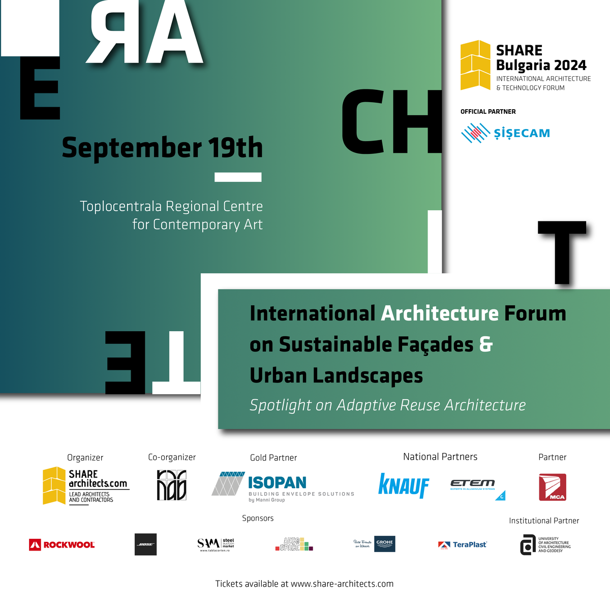 Международният архитектурен форум SHARE Bulgaria 2024 ще се проведе на 19 септември в РЦСИ „Топлоцентрала“ в София. За осма поредна година конференцията ще привлече изтъкнати лектори от водещи архитектурни фирми в Европа и извън нея. Участниците ще дискутират темата за устойчивите фасади и градските пейзажи, фокусирайки се върху адаптивната повторно използвана архитектура. На форума ще бъдат представени актуални национални и чуждестранни архитектурни проекти, отличени в престижни конкурси, както и модерни строителни технологии.