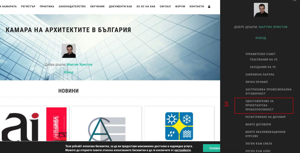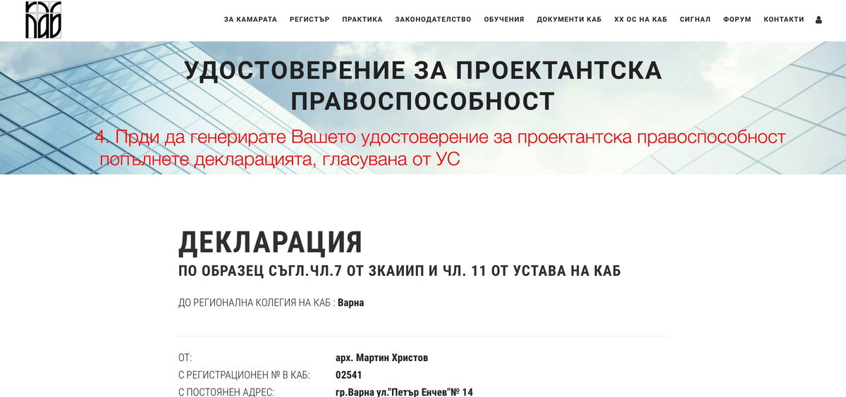 През 2022г. удостоверенията за проектантска правоспособност и застраховка ще се получават само в електронен вид и ще се свалят от сайта kab.bg. След отваряне на страницата на сайта за достъп до удостоверението е необходима следната последователност от действия: