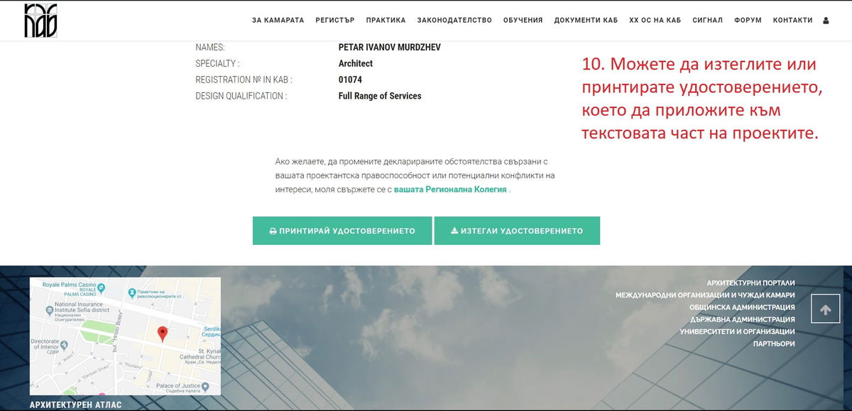 9. В генерираното удостоверение, освен вашите данни има линк и QR код за достъп до Вашия актуален профил в регистъра на КАБ.