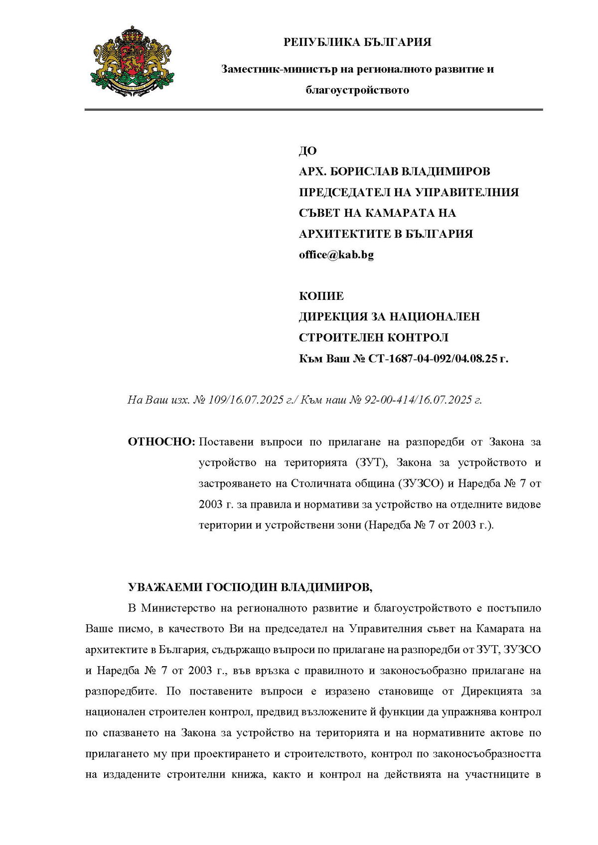 Становището е изготвено в отговор на въпроси по проблемни казуси от практиката, събрани и поставени пред МРРБ и ДНСК от Камарата на архитектите в България (КАБ). Инициативата на КАБ цели уеднаквяване на тълкуването и прилагането на нормативната уредба. Вижте пълния текст на писмото на КАБ от 16 юли 2025 г. тук.