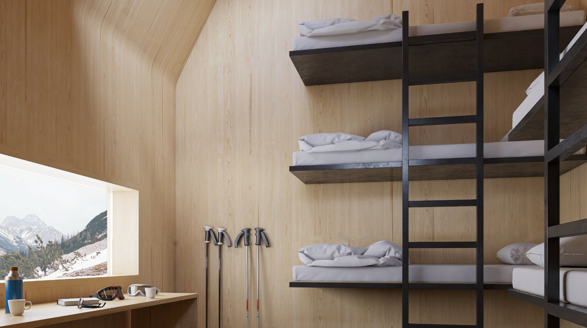 - Indoor perspective of Khazana Mountain Shelter © WE:R Architecture